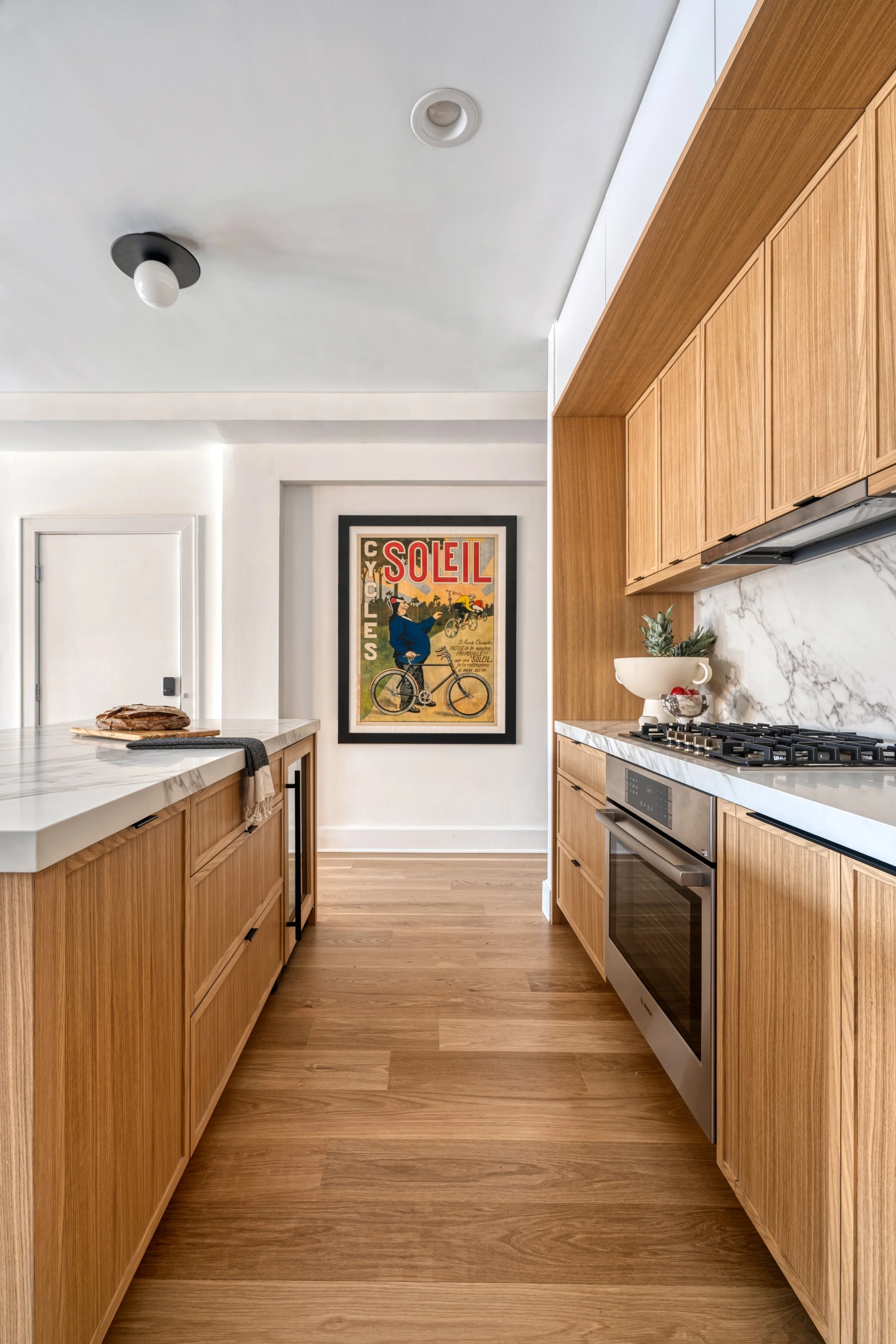 Custom millwork was used to resolve dimensional inconsistencies, bringing clarity and alignment to walls that previously felt fragmented. New white oak flooring and a neutral palette lighten the interior, with tone and texture introduced through wood-grain cabinetry, slatted joinery, and veined stone surfaces.
